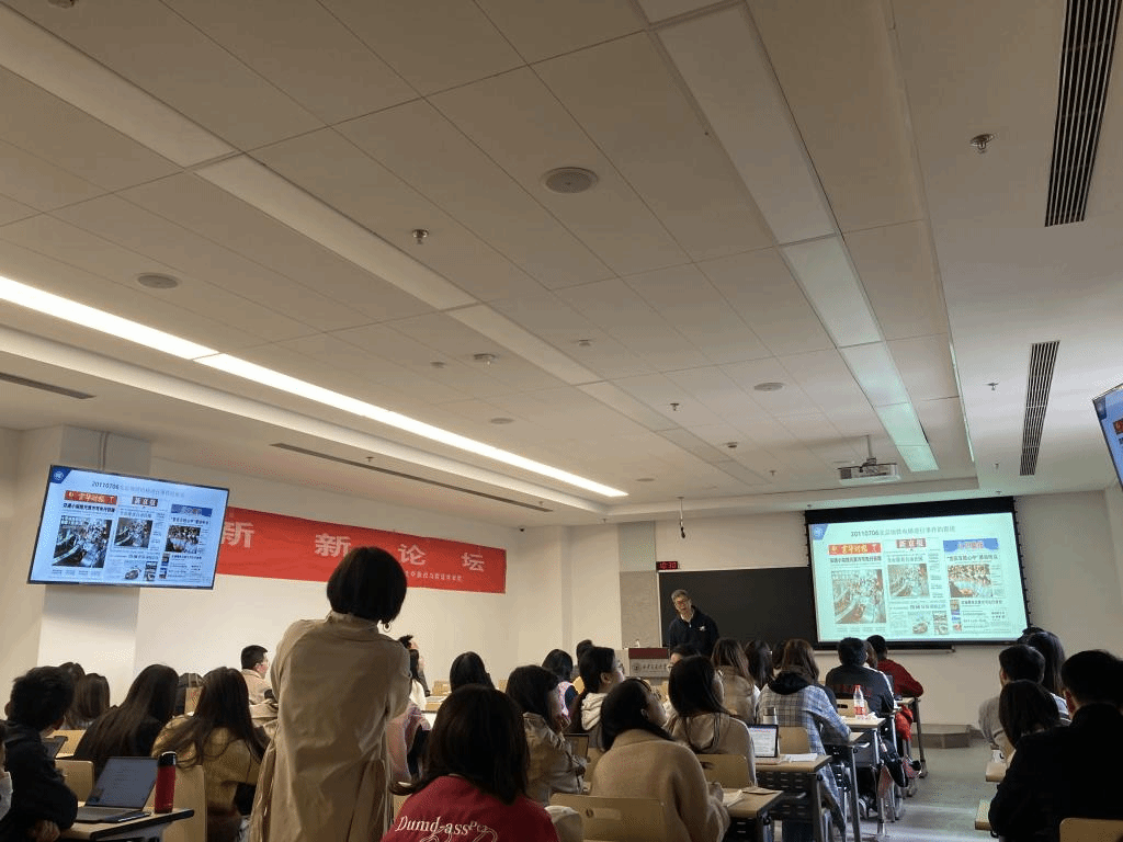 随后,朱春阳教授以2011年北京地铁电梯事件为例与师生进行互动,提出“如何实现政府与大众的良性沟通”这一问题,引发了现场激烈讨论。朱教授指出,对危机事件的错误处理即可视为政府部门“不闻”,进而导致政府公信力下降。因此,在当今正能量饥渴的时代背景下,媒体更应时刻牢记正能量的传播需要专业与诚意保驾护航。而在谈到现代传播体系时,朱教授则表示,现代传播体系代表着面向当代政治文明的新秩序,具有“全地”“全时”“全民发声”的新特点。在此背景下,传统主流媒体应以正面宣传报道作为能力结构主体;对新型主流媒体的要求则更高,需承担起正面宣传报道与危机沟通能力协同发展的重任。总而言之,新型主流媒体要能镶嵌于现代传播体系之中和谐运行,成为现代传播体系下的一颗高质量龙种。